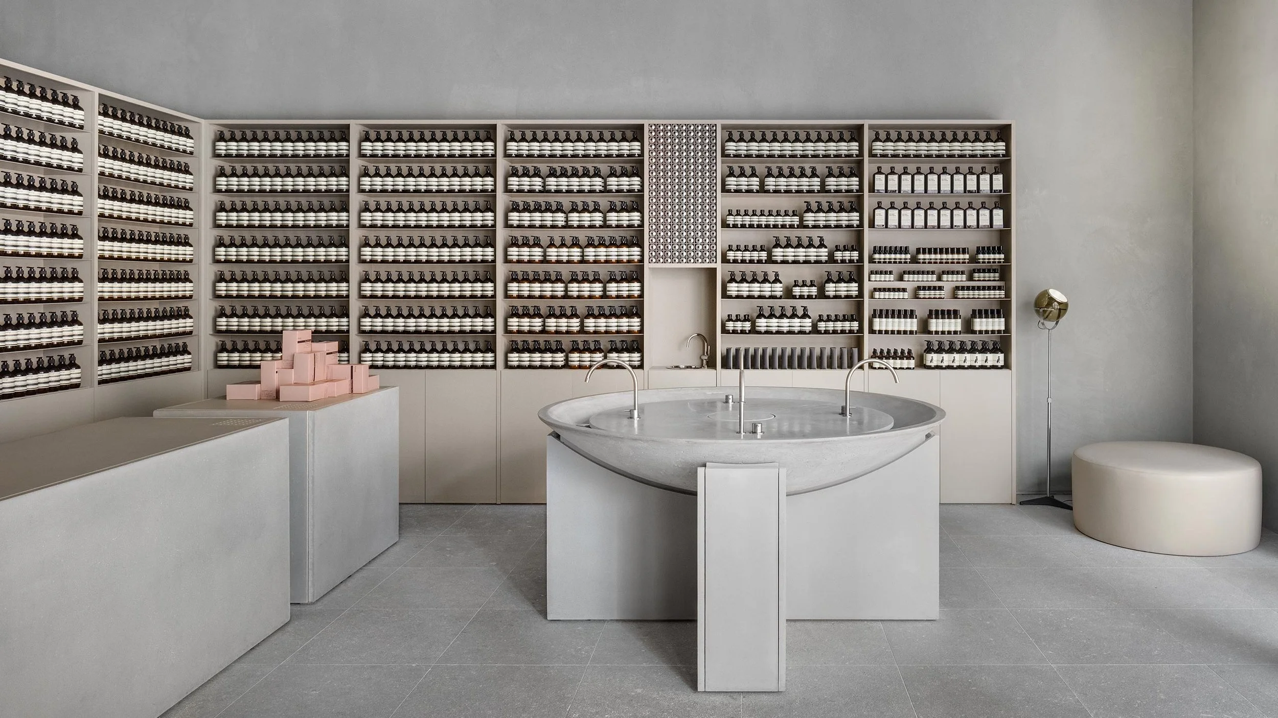 A wide, arched, concrete façade marks the threshold between the bustling centre and the serene store.